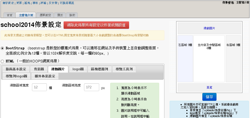 吴老师好,将tadtools一路更新到2.33,tad_themes更新到3.0,在后台对tad_themes进行设定时不知到如何分栏?原来2.8后台管理和3.0的管理界面差别太大了(如下图),没有栏数设定,没有上传滑动图片设定等等,不知道是不是我安装的问题。谢谢!