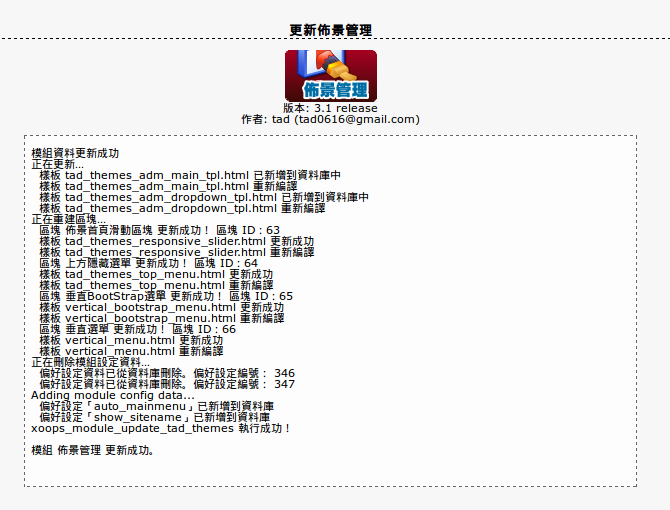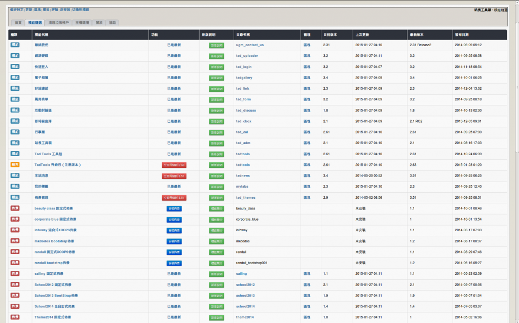 我安裝的環境是直接安裝最新的 Xoops 2.5.7,加上一堆Tad_* 模組,也包括 Tad_Tools 和 Tad_Adm 請參考附加檔案。