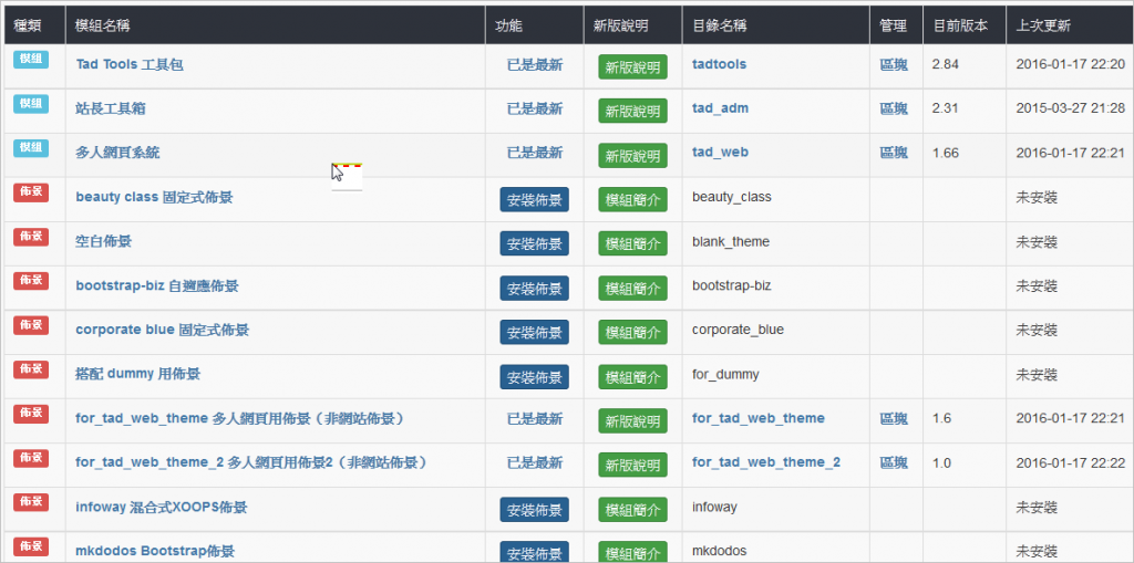 3.想重新安裝一次模組看看,結果移除時也一片空白,返回模組看到已移除,但實際資料表卻沒有移除,手動移除資料表重裝之後,情況依舊。