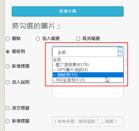 請問電子相簿一個問題,在後台相片管理時,使用將勾選的相片搬移到,旁邊的下拉式選單按下去沒出現任何目錄,所以沒辦法將相片作搬動,如此在相片管理上很不方便,請問這是什麼問題呢??