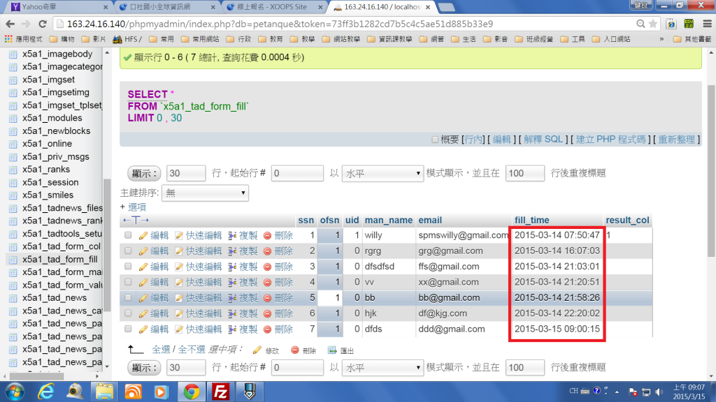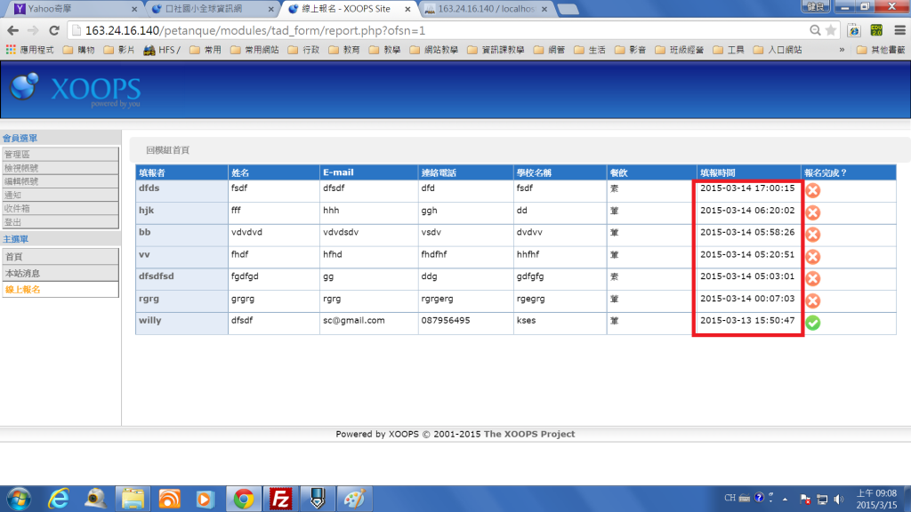 我利用萬用表單做線上報名用,發現報名時間會比伺服器晚16小時,xoops及伺服器均設定台北時區,pc的時間也沒有問題,請問老師問題會在哪裡?萬用表單是最新版。