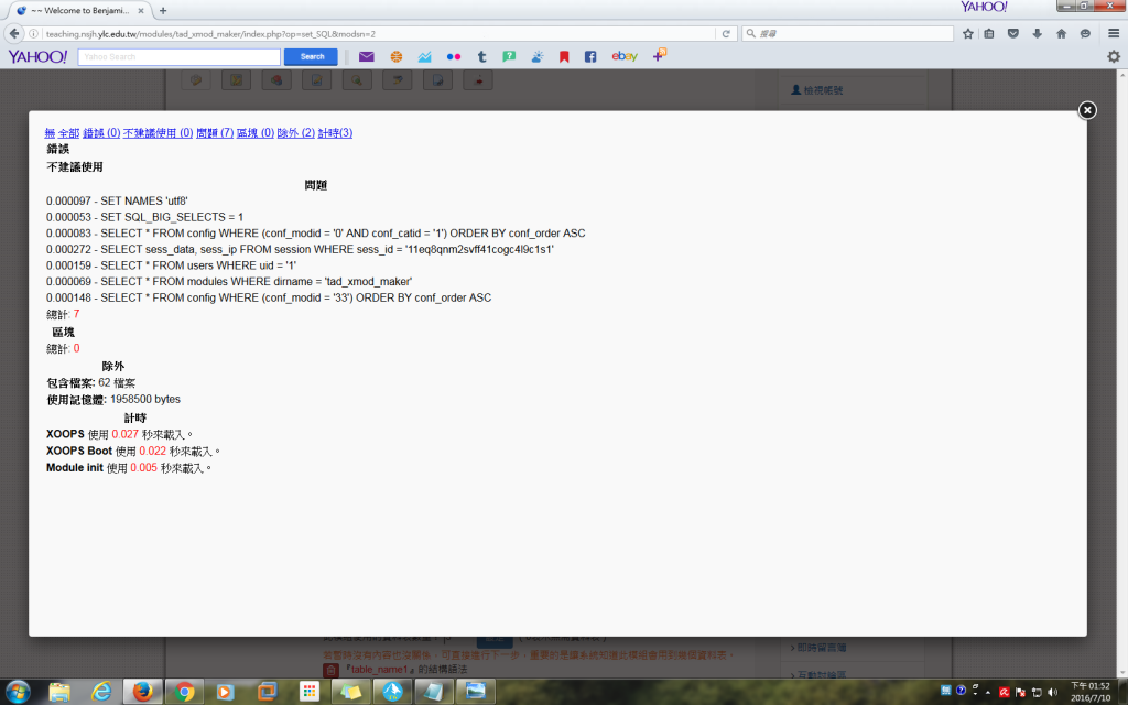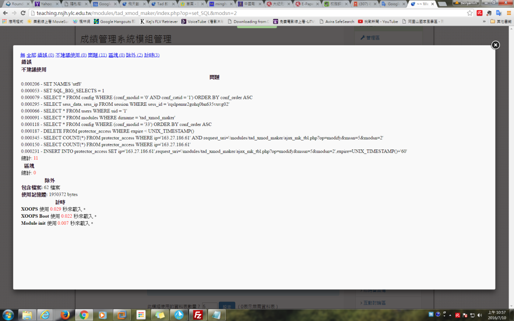 以及在模組製造機第2 步 設定資料表...當我按下「觀看」、「編輯」、或「設定該表單欄位」時,都會出現一大片空白的方框,只右上角有小「x」,開除錯裏面的訊息如下...