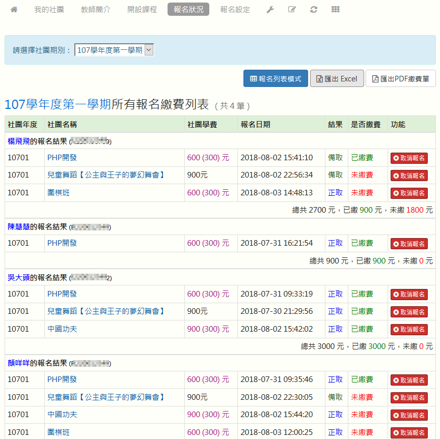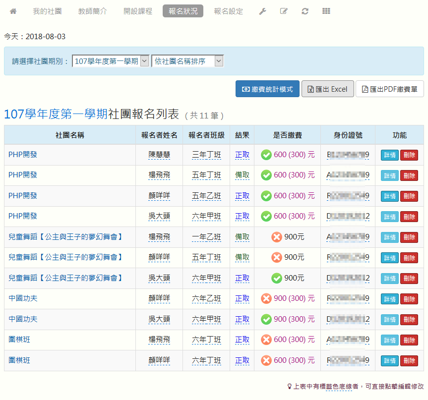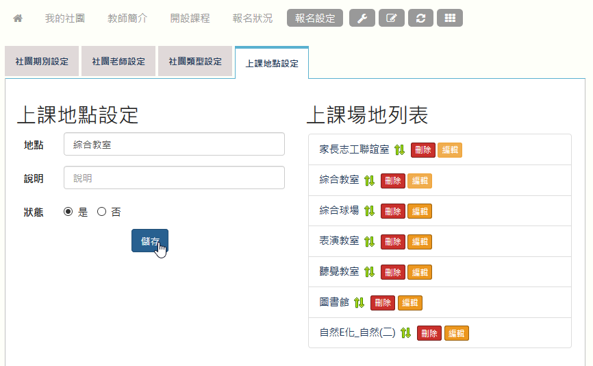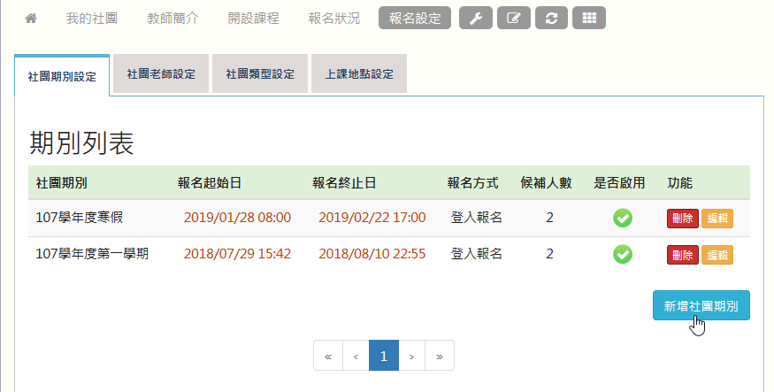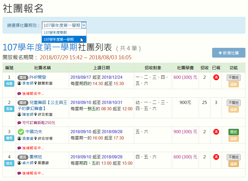 2.每期別結束後,下期的社團可用"複製期別"來節省新增社團的時間,但是要記得修改每個社團的上課時間。