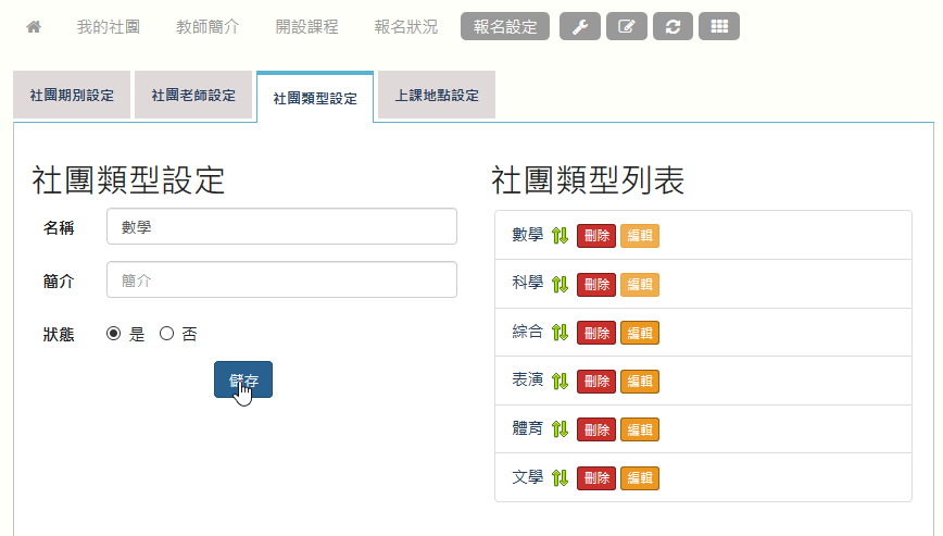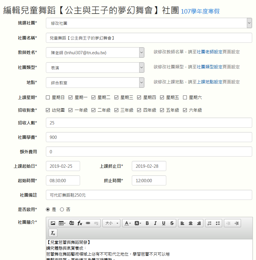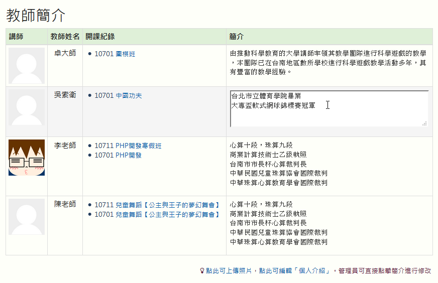 4.社團老師由報名設定介面自行新增設置,不需要再從會員中新增,欄位輸入教師姓名即可。教師簡介一同修正。提醒:社團老師將失去自行新增社團課程的功能。如不要修正此功能,請勿更新本版社團報名模組。