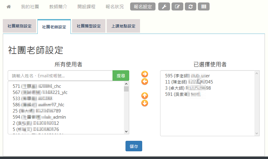 管理者權限負責開設社團期別、開課教師、上課場地、社團類型的管理以及統計各期別的報名結果和是否開課成功。