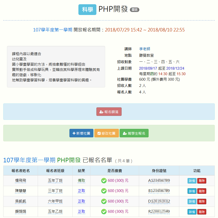 此模組是用來提供社團、課程或研習的報名系統。權限可分為訪客(報名者)、開課老師、管理者。