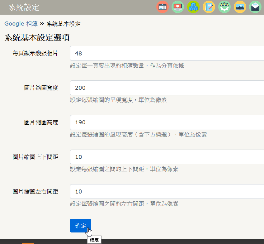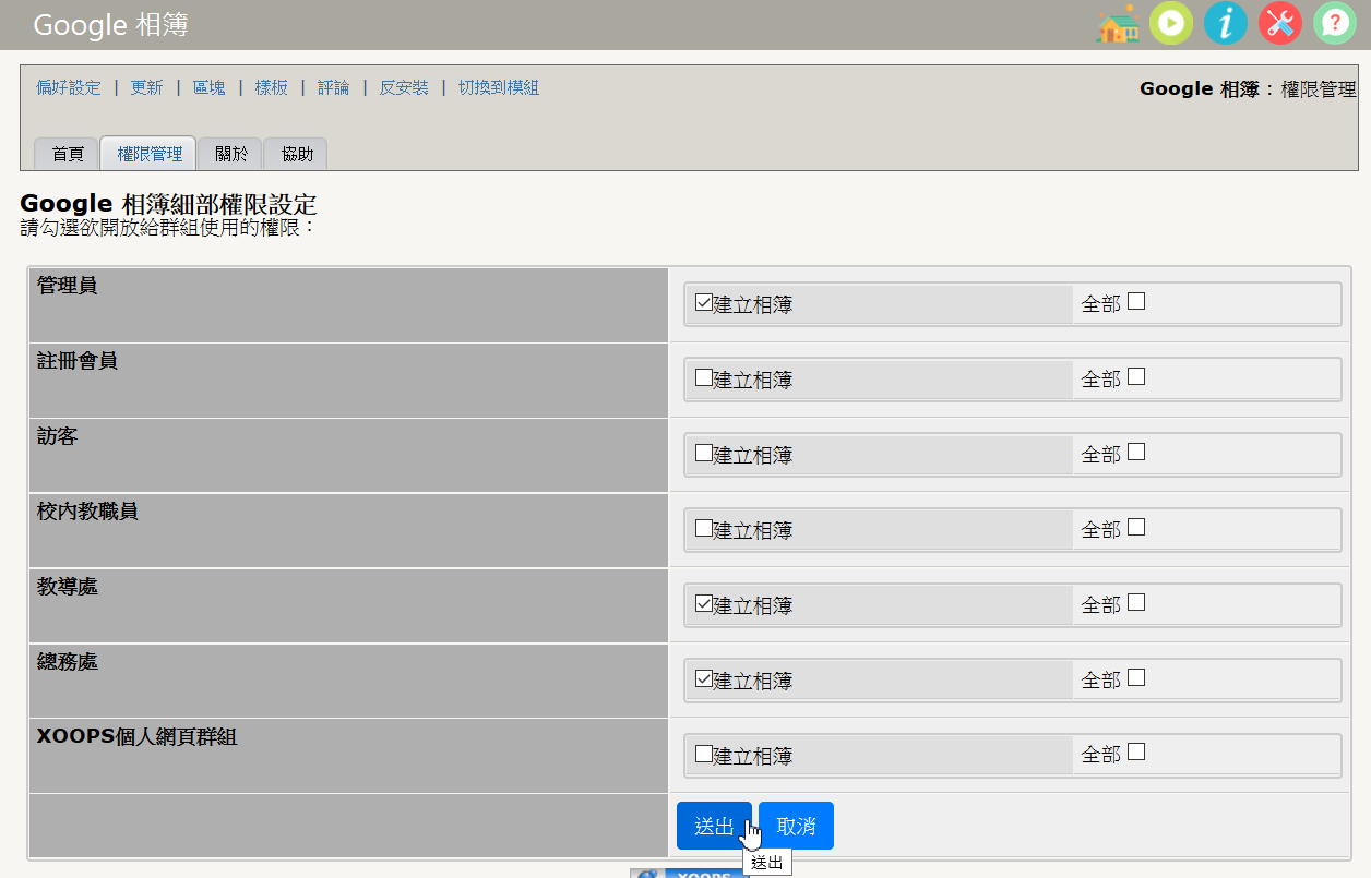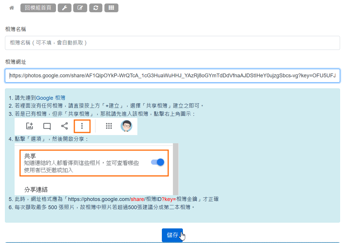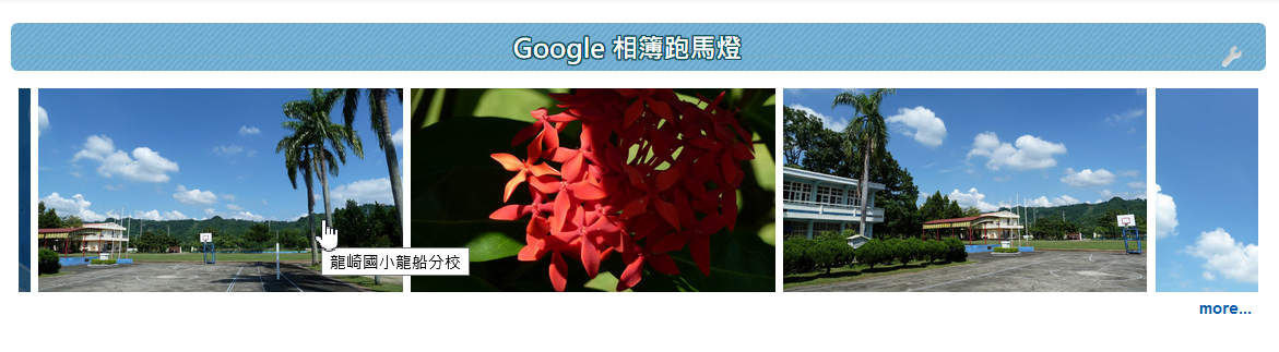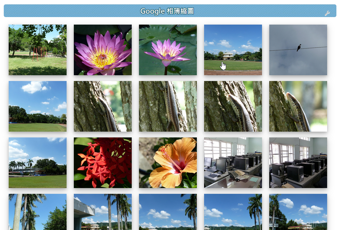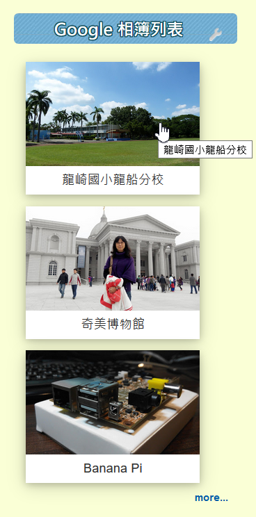 很多學校有Google的無限空間可以使用,Google相簿在使用上也相當方便,但困擾的是,放在Google上的相片無法利用 <iframe> 嵌入到網站中,因此,就做了這個模組,除了讓您可以一個步驟就把Google相簿抓到自己網站上呈現,亦可套用到各種區塊上,更棒的是相片仍然是放在Google上,不佔自己主機的使用空間喔!