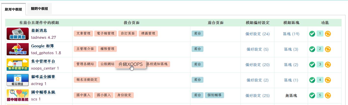 4. 可以直接點擊後台或前台頁面,還會列出有多少區塊或偏好設定,亦可直接開關模組或更新組